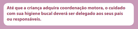 Desde os primeiros dias de vida, a adoção de cuidados com a saúde bucal deve ser estimulada e motivada pelos profissionais da equipe de saúde. A prática de hábitos de vida saudáveis irá prevenir o aparecimento de doenças bucais na primeira infância, repercutindo na promoção à saúde para toda a vida.