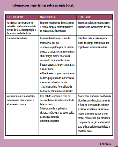 Nesse primeiro momento, deve-se ouvir a família e observar o comportamento do recém-nascido. Orientar as dúvidas que os pais e os familiares tiverem, como: aleitamento materno; uso de bicos e chupetas; sucção digital (chupar o dedo); higiene bucal; uso de creme dental; alimentação; e manifestações mais frequentes.