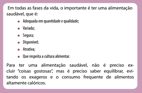 Uma alimentação saudável é aquela que reúne os seguintes atributos: é acessível e não é cara, valoriza a variedade, as preparações alimentares usadas tradicionalmente, é harmônica em quantidade e qualidade, naturalmente colorida e segura sanitariamente.