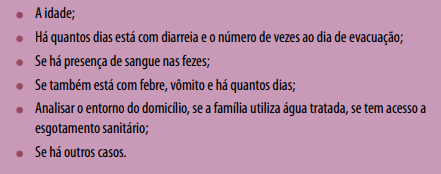 • Criança com diarreia (três ou mais evacuações líquidas ou semilíquidas em 24 horas) com sinais de desidratação: está inquieta, irritada, com sede, olhos fundos, sinal da prega (a pele volta lentamente ao estado anterior quando com os dedos polegar e indicador são usados para levantar a pele);