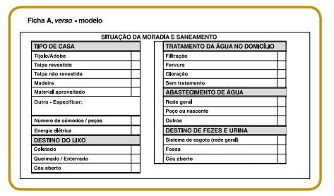 Agora que você já sabe como preencher a frente da ficha, vamos aprender a parte de trás, o verso da ficha. Os campos do verso da Ficha A servem para caracterizar a situação de moradia e saneamento e outras informações importantes acerca da família.
