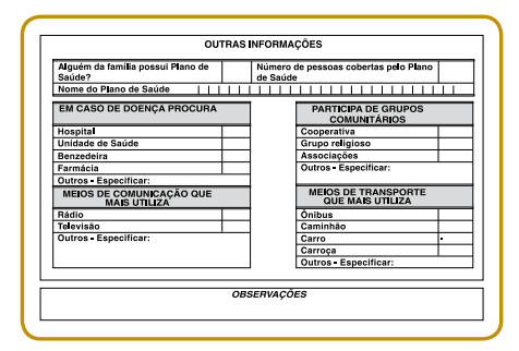 Depois, você deve anotar que tipo de socorro aquela família está acostumada a procurar em caso de doença e quais os meios de comunicação mais utilizados na casa. À direita, estão os quadros para anotar se aquela família participa de grupos comunitários e para informar que meios de transporte mais utiliza. Para completar, vem o espaço para você escrever as observações que considerar importantes a respeito da saúde daquela família.