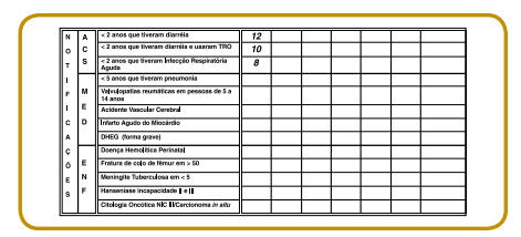Por fim, vem o quadro para registrar o tipo de doença ou condições em que se encontra a pessoa. Você não deve solicitar comprovação de diagnóstico e não deve registrar os casos que foram tratados e já alcançaram cura.