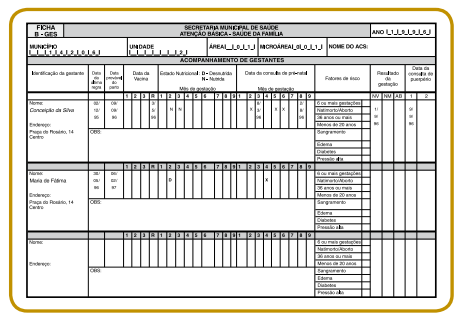 Na Ficha B-GES o ACS cadastra e acompanha mensalmente o estado de saúde das gestantes. A cada visita, os dados da gestante devem ser atualizados nessa ficha, que deve ficar de posse do ACS, sendo discutida mensalmente com o enfermeiro instrutor/supervisor.