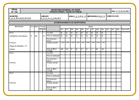 A Ficha B-HA serve para o cadastramento e acompanhamento mensal dos hipertensos. Atenção: só devem ser cadastradas as pessoas com diagnóstico médico estabelecido. Os casos suspeitos (referência de hipertensão ou pressão arterial acima dos padrões de normalidade) devem ser encaminhados imediatamente à Unidade Básica de Saúde para realização de consulta médica. Só após esse procedimento, com o diagnóstico médico estabelecido, é que o ACS cadastra e acompanha o hipertenso.