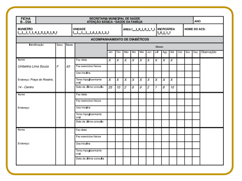 A Ficha B-DIA serve para o cadastramento e acompanhamento mensal dos diabéticos. Atenção: só devem ser cadastradas as pessoas com diagnóstico médico estabelecido. Os casos suspeitos (referência de diabetes) devem ser encaminhados à Unidade Básica de Saúde para realização de consulta médica. Só após esse procedimento é que o ACS cadastra e acompanha o diabético. Os casos de diabetes gestacional não devem ser cadastrados nessa ficha.