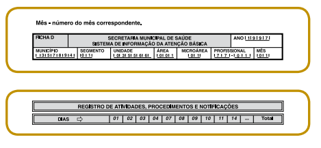 Orientações para preenchimento da Ficha D – registro de atividades, procedimentos e notificações A Ficha D é utilizada por todos os profissionais da equipe de saúde. Cada profissional entrega uma Ficha D preenchida ao final do mês. O preenchimento desse instrumento deve ser diário, considerando-se os dias efetivos de trabalho em cada mês.