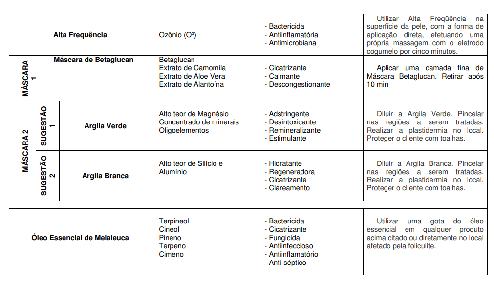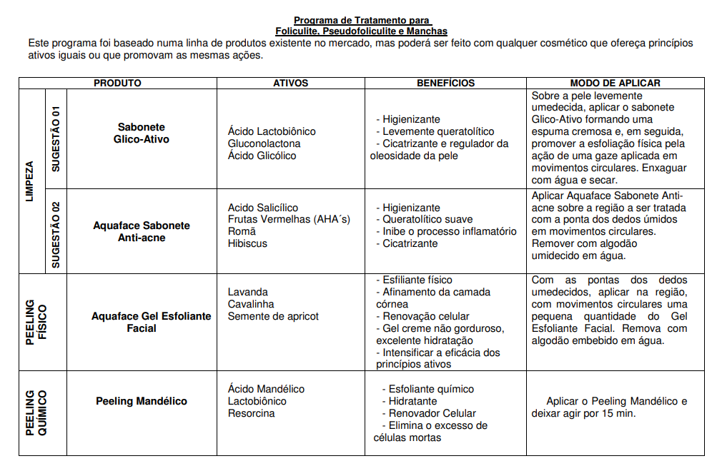 foliculite, pseudofoliculite e hiperpigmentação pós-inflamatória e fazer uma busca dos recursos já disponíveis na área de estética que podem atender as necessidades no tratamento das mesmas, montou-se um programa de tratamento que pode auxiliar os profissionais na solução destes problemas. Baseando-se numa linha de cosméticos que oferece em suas formulações princípios ativos que podem atuar nas manifestações existentes nestas alterações da pele, apresenta-se este programa esquematizado no quadro a seguir, que pode ser aplicado após a recuperação da sensibilidade da pele causada pela depilação que varia de 3 a 7 dias.