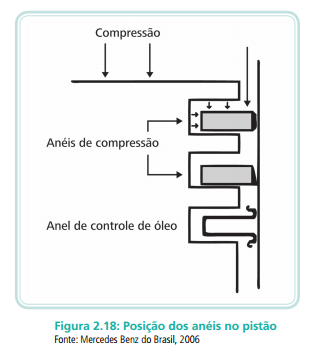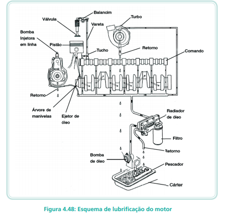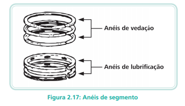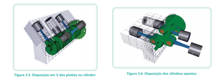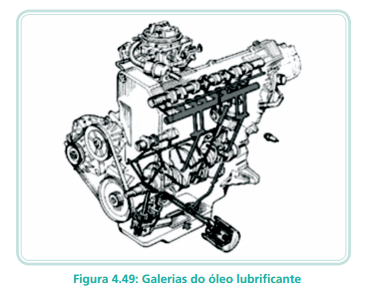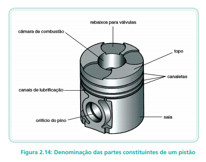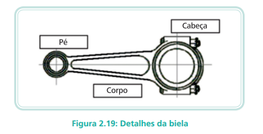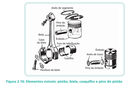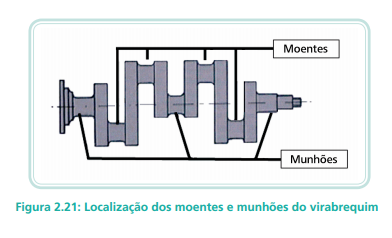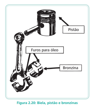 Na parte inferior do bloco estão os alojamentos dos mancais centrais, onde se apoia o eixo de manivelas ou virabrequim. Nos motores com movimento do virabrequim horizontal (Fusca) de cilindros opostos, o eixo de manivelas acha-se no centro do bloco. Este, por sua vez, é composto de duas partes justapostas, afi xadas por parafusos, como se vê na Figura 2.4.