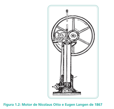 Apresentado pela primeira vez na Exposição Industrial de Paris, em 1867, o motor concebido por Nicolaus Otto e Eugen Langen, Figura 1.2, tinha características bem melhores de desempenho. O conceito desse motor era o de “pistão livre”, impulsionado pela explosão dos gases no cilindro, o pistão estava ligado a um volante através de uma cremalheira e uma engrenagem. No retorno do pistão, produzia-se trabalho mecânico.
