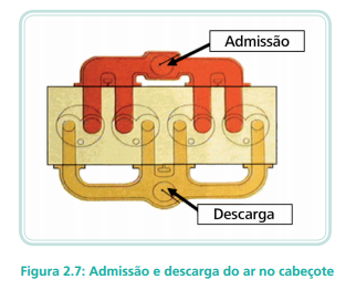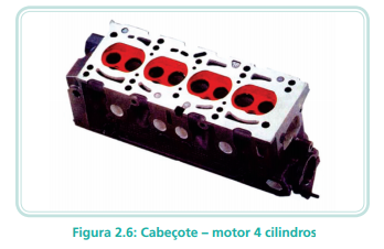 O cabeçote tem a função de tampar os cilindros, conforme se vê na Figura 2.6, formando a câmara de combustão na parte superior do bloco do motor. Nele, ocorrem altas pressões por conta do pistão que comprime a mistura, no caso do ciclo Otto, ou o ar, no caso dos motores de ciclo Diesel. Geralmente, possui orifícios com roscas onde são fixadas as velas de ignição ou os bicos injetores e alojadas as válvulas de admissão e escape ou descarga. A união do bloco com o cabeçote, em razão da total vedação, requer uma junta de amianto revestida de metal.