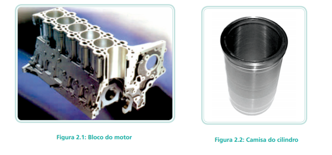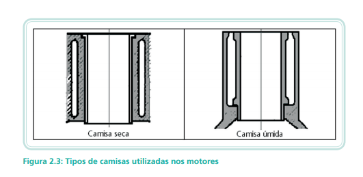 Motores modernos utilizam o alumínio e ligas em lugar do ferro fundido, apresentado na Figura 2.1, obtendo como principais resultados melhor dissipação de calor e redução do peso. Alguns blocos possuem cilindros removíveis em formato de tubos os quais formam as paredes do cilindro no bloco propriamente dito, denominados “camisas”, como mostra a Figura 2.2. As camisas podem ser úmidas, quando o líquido de arrefecimento está em contato direto com a camisa e que entre si trocam calor; ou secas, quando o líquido de arrefecimento não está em contato direto com a camisa (Figura 2.3).