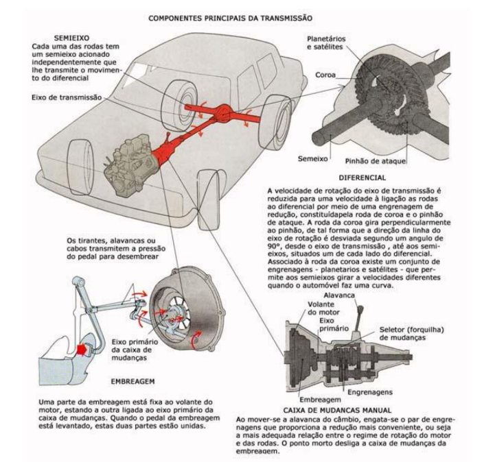 A transmissão comunica às rodas a potência do motor transformada em energia mecânica. Num automóvel convencional, com motor dianteiro, a transmissão tem inicio no volante do motor e prolonga-se através da embreagem, da caixa de câmbio, do eixo de transmissão e do diferencial até as rodas de trás. Os automóveis com motor à frente e com tração dianteira ou com o motor atrás e tração nas rodas de trás dispensam o eixo transmissão sendo, neste caso, o movimento transmitido por meio de eixos curtos. A embreagem, que se situa entre o volante do motor e a caixa de cambio, permite desligar a energia motriz da parte da parte restante da transmissão para libertar esta do torque quando as mudanças são engrenadas ou mudadas.