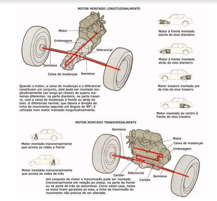 Tal conjunto pode ser montado longitudinal ou transversalmente em relação ao chassi e mover as rodas, quer seja a da frente, quer seja a de trás. Quando o motor é montado transversalmente, não é necessária qualquer alteração (90º) da direção do movimento, pois todos estão paralelos aos eixos das rodas.