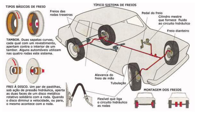 Em todos os automóveis atuais, o pedal do freio aciona hidraulicamente os freios. A ligação mecânica por meio de tirantes ou cabos ou por meio de ambos está reservada para o sistema de freio de mão, normalmente utilizado apenas após a parada do automóvel. Um sistema hidráulico de freio apresenta várias vantagens sobre um sistema acionado mecanicamente. É silencioso, flexível e auto lubrificado e assegura a aplicação de forças de frenagem automaticamente igualadas em ambos os lados do automóvel.