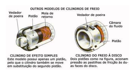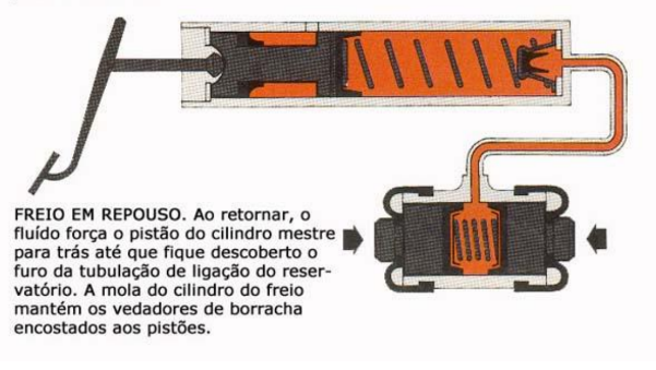 Funcionamento conjunto dos cilindros – A pressão necessária para acionar os freios hidráulicos é gerada no cilindro mestre. Uma haste, movida pelo pedal dos freios, obriga o pistão a avançar.