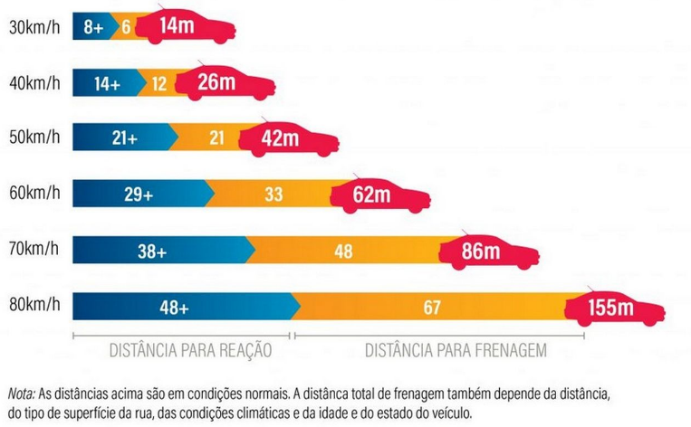 O quadro mostra as distâncias percorridas, durante os tempos de reação e de frenagem, por automóveis de dimensões médias, equipados com freios de 60% e 80% de eficácia e a uma velocidade de deslocamento de 50 km/h, 80 km/h e 110 km/h.