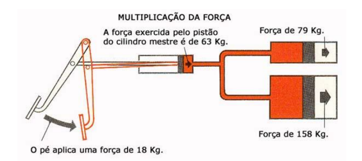 A força exercida pelo motorista no pedal do freio é aplicada ao pistão do cilindro mestre depois de multiplicada por efeito de alavanca e, em seguida, transmitida pelo fluído até aos pistões dos cilindros do freio, onde é novamente multiplicada, em virtude de o diâmetro destes ser superior ao diâmetro do cilindro mestre. Neste diafragma, onde as dimensões aparecem aumentadas para melhor compreensão, o curso do pedal é 3,5 vezes superior ao pistão do cilindro mestre que, por seu turno, é 1,25 e 2,5 vezes maior do que os cursos dos pistões dos cilindros do freio. Assim, estes pistões aplicam uma força maior percorrendo, contudo, um curso menor.