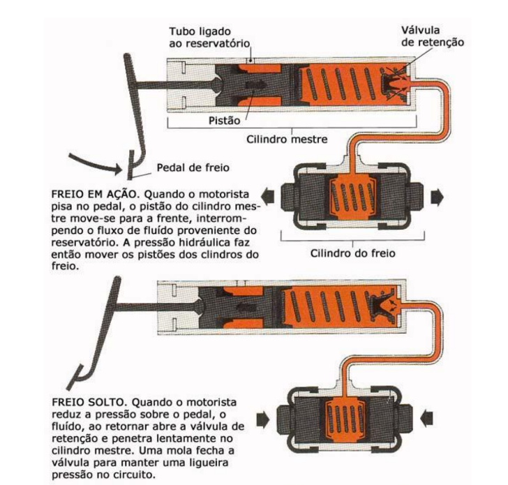 O pedal de freio está ligado, por meio de uma haste curta ao cilindro mestre. Quando o motorista pressiona o pedal, a haste faz mover o pistão no interior do cilindro mestre, empurrando o fluido hidráulico e forçando-o, através dos tubos, passar para os cilindros do freio das rodas, que aciona os freios. Uma válvula de retenção existente na extremidade de saída cilindro mestre mantém-se sempre uma ligeira pressão no circuito dos freios, a fim de impedir a entrada do ar.