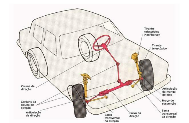 Para dirigir um automóvel recorre-se ao volante, que vira as rodas da frente na direção pretendida, seguindo as rodas de trás a trajetória daquelas.