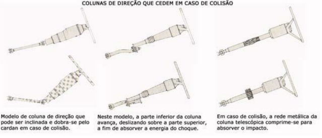 A coluna da direção pode ser construída de modo a ceder ou dobrar em caso de colisão. Por exemplo, no sistema AC Delco a coluna tubular é constituída por uma rede metálica que, apesar de resistir à torção, cede e absorve energia quando comprimida longitudinalmente. O eixo da direção apresenta uma união telescópica. Em outro sistema o eixo está dividido em seções, ligadas entre si por cardans, cujo eixo geométrico não é comum.