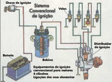 O sistema de ignição (Figura 6) produz uma corrente elétrica de alta tensão e transmite-a para a vela de ignição pelos cabos de vela. A corrente flui primeiro para um distribuidor, facilmente identificável embaixo do capô da maioria dos carros. Um cabo chega ao centro do distribuidor, e quatro, seis ou oito cabos (dependendo do número de cilindros) saem dele, para cada vela de ignição. O motor é sincronizado de modo que somente um cilindro receba uma corrente do distribuidor de cada vez. Em muitos motores modernos não existe mais o distribuidor físico, substituído por sistema eletrônico.