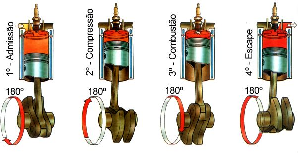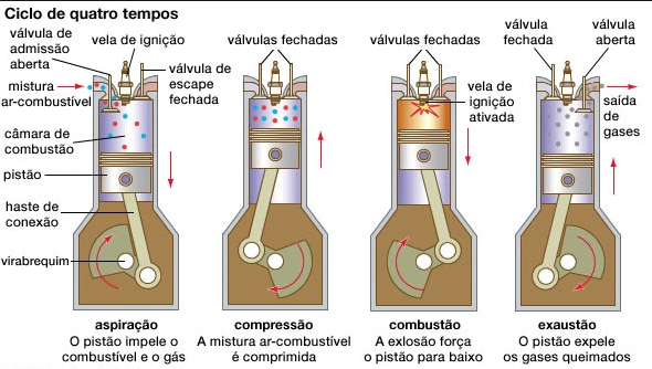 Quase todos os carros atualmente usam o que é chamado de ciclo de combustão de 4 tempos para converter a gasolina em movimento. Ele também é conhecido como ciclo Otto, em homenagem a Nikolaus Otto, que o inventou em 1867. Os 4 tempos estão ilustrados na Figura 1. Eles são