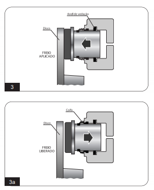 Quando a pressão no pedal é aliviada, os êmbolos se retraem com a ajuda do anel de vedação do êmbolo (figuras 3 e 3a), que atua como uma espécie de mola, liberando a folga original entre as pastilhas e o disco, que volta a girar livremente.