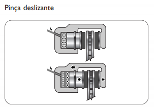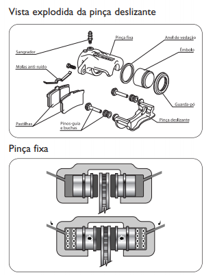 A pinça com carcaça fixa tem um êmbolo para cada pastilha. A pinça deslizante ou flutuante geralmente possui um único êmbolo para ambas as pastilhas e se movimenta sobre parafusos-guia ou superfícies usinadas. Sempre que substituir as pastilhas, faça a verificação das pinças, êmbolos, anéis de vedação, guarda-pó e pinos deslizantes. Se estiverem gastos ou com sinais de corrosão, devem ser substituídos. Um êmbolo emperrado mantém a pastilha sempre encostada no disco, desgastando-a rapidamente, superaquecendo o freio, além de comprometer a trajetória do veículo durante a frenagem.