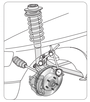 Posicione a ponta de contato do relógio comparador cerca de 5mm abaixo da borda do disco de freio. Gire o disco vagarosamente e faça a leitura. Nos veículos leves a oscilação lateral do conjunto disco/cubo/rolamento não deve exceder 0,10mm.
