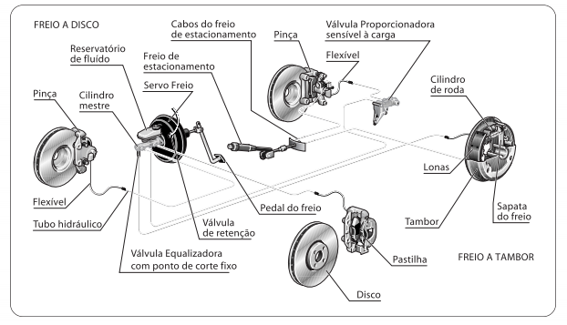 Em outras palavras, quando pisamos no pedal do freio, estamos aplicando uma pressão no fluido de freio através do êmbolo do cilindromestre onde o fluido está depositado. Essa pressão será transmitida com a mesma intensidade para todo o sistema de freio através de tubulações e mangueiras de borracha reforçada, conhecidas como flexíveis. Os flexíveis são utilizados em pontos onde se requer flexibilidade, como nas rodas dianteiras em função do esterçamento.