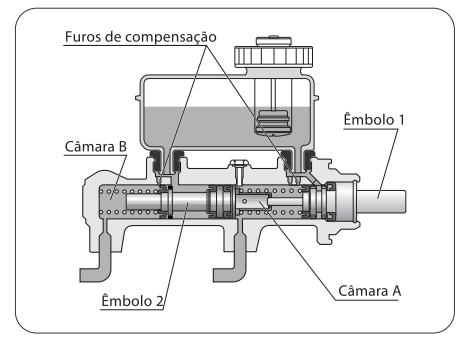Sua função é gerar e manter a pressão hidráulica em todo o sistema. Por questão de segurança os veículos utilizam cilindros-mestres com sistemas de duplo circuito diagonais ou paralelos para conduzir o fluido até as rodas. Dessa forma, se um dos circuitos falhar, o outro circuito terá pressão suficiente para a frenagem. Funciona como se tivéssemos dois cilindros simples interligados. As duas câmaras estão ligadas ao reservatório e cada uma delas possui um furo de alimentação e outro de compensação. Entre os êmbolos está montada uma mola. Ao pisarmos no freio, o pedal empurra o êmbolo 1 e este empurra o êmbolo 2 através da mola, fazendo com que haja pressão simultânea nas duas câmaras. Cada câmara irá fornecer pressão hidráulica para duas rodas do veículo.