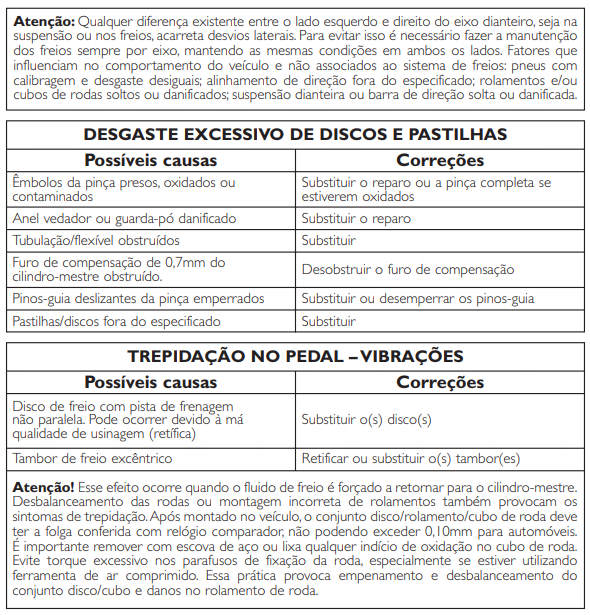 Os discos devem ser substituídos sempre que atingirem a espessura mínima determinada pelo fabricante ou quando apresentarem trincas ou empenamento. Não observar essa regra poderá resultar em: