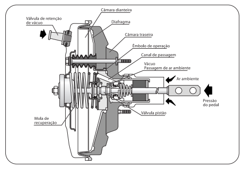 A sucção de ar (vácuo) é feita através de uma mangueira que liga a válvula de retenção do servo ao coletor de admissão do motor. A válvula de retenção evita a perda do vácuo no interior do servo.