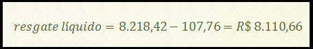 Se o montante da aplicação é R$ 8.218,42 e será pago IR no valor de R$ 107,76, a entrada de caixa líquida para o aplicador será a diferença entre esses dois valores: