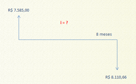 Resumindo, no início da operação o aplicador desembolsou R$ 7.500,00 (principal) + R$ 85,00 (taxa) = R$ 7.585,00. Supondo que fará o resgate em 8 meses, vimos que o resgate líquido (descontado o imposto de renda) é de R$ 8.110,66. Logo, o fluxo de caixa do aplicador na operação pode ser expresso da seguinte forma: