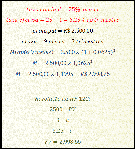 Seguindo com o exemplo sugerido, se a taxa nominal é 25% ao ano, com capitalização trimestral, então a taxa efetiva é 25/4 = 6,25% ao trimestre. Essa é a taxa efetiva, a ser usada nos cálculos de juros e montantes, em regime de juros compostos. Repare que a conversão da taxa nominal para a taxa efetiva foi feita de modo proporcional. Vamos supor que se tome emprestado R$ 2.500,00 e se queira saber o saldo da dívida após 9 meses. Nesse caso: