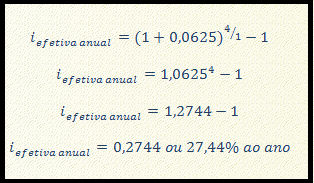 Ilustrando, vimos que no exemplo dado, a taxa nominal é 25% ao ano e a taxa efetiva é 6,25% ao trimestre. Se calcularmos a taxa anual equivalente à taxa efetiva trimestral, teremos: