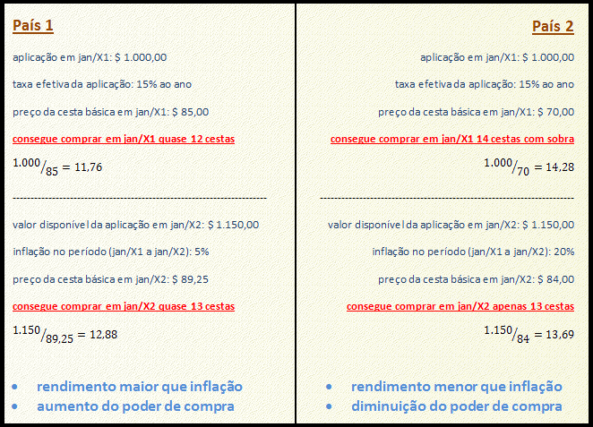 Vemos na simulação abaixo que o aplicador no país 1 poderia comprar quase 12 cestas básicas com o valor que aplicado. Como a taxa da aplicação é maior que a inflação, após 1 ano teve seu poder de compra aumentado, podendo comprar quase 13 cestas. Já o aplicador do país 2 poderia comprar 14 cestas com o valor aplicado. Porém, a taxa da aplicação não supera a inflação, por isso tem seu poder de compra diminuído; após 1 ano não consegue comprar as 14 cestas que comprava anteriormente.