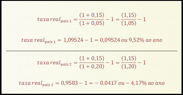 Suponha agora que duas pessoas, em dois países distintos, façam aplicações financeiras com a mesma taxa efetiva (descontadas tarifas e impostos, como explicado na seção anterior), cujo valor é 15% ao ano. Porém, uma delas está em um país cuja inflação anual é de 5% ao ano, e a outra está em um país cuja inflação é 20% ao ano. Embora tenham feito aplicações com a mesma taxa efetiva, o resultado não é o mesmo.