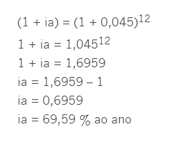 Qual a taxa anual de juros de um financiamento que cobra juros mensais de 4,5%. Temos que 4,5% = 4,5 / 100 = 0,045