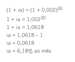 Determine a taxa mensal equivalente a 0,2% ao dia. Sabemos que 0,2% = 0,2 / 100 = 0,002