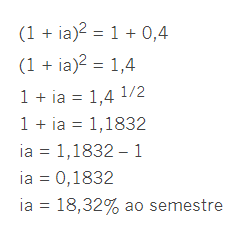 Qual a taxa semestral equivalente a 40% ao ano. Temos que 40% = 40 / 100 = 0,4