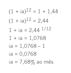 Qual a taxa mensal de juros referentes a uma taxa anual de 144%. Temos que 144% = 144/100 = 1,44
