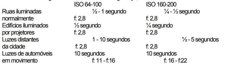áreas extensas, como as ruas. Daqui resulta que a fotografia noturna apresenta por vezes manchas de luz com áreas intermédias de sombra; e embora os olhos possam compensar a observação de contrastes elevados de luz, isso não acontece com a película fotográfica. Deve trabalhar-se fora do campo com muita luz, e se pudermos aproximar-mos, ou mudar de ponto de vista de modo que a luz pareça mais uniforme, tanto melhor. Sempre que possível, convém evitar que as lâmpadas nuas apareçam na fotografia pois podem produzir difusão luminosa. A maior parte da iluminação artificial é muito mais fraca que a iluminação natural, pelo que, em geral, é preciso combinar uma película rápida com a velocidade de obturação lenta. Por exemplo, até uma área da cidade com diversões, bem iluminada, fotografada com película ISSO 400, necessitará de exposições da ordem de 1/60s com f:4. Neste caso tem de se utilizar uma fotocâmara que não dispare automaticamente a unidade de luz de relâmpago quando a luz for fraca. Além desse equipamento poderá ser necessário outro, q que depende do tipo de fotografia noturna que se pretenda. Há que se fazer uma escolha básica entre as fotografias efetuadas com um tripé e uma exposição demorada, e as realizadas com a máquina na mão e película rápida. Se nos interessarmos por cenas sem movimento, como edifícios e paisagens citadinas, é preferível usar película de grão médio ou fino e tempos de exposição de alguns segundos. O movimento do tráfego e das pessoas ficará desfocado, mas as riscas das luzes dos automóveis podem aumentar o interesse da imagem. Se a luz for insuficiente para permitir uma mediação com o fotômetro, a tabela seguinte fornece uma indicação que servirá de guia; convém efetuar fotografias escalonadas como segurança;