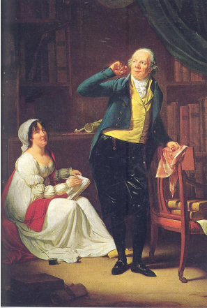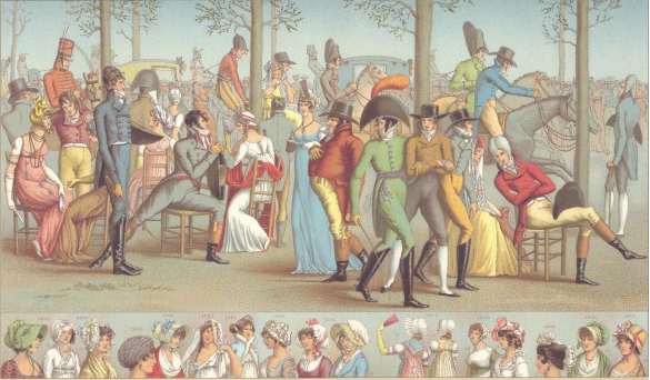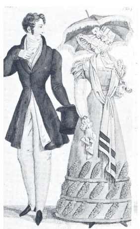 As perucas, os penteados elaborados e os cabelos empoados também desapareceram (Veja na imagem abaixo). Assim, também sob a influência de Napoleão que ascendeu ao poder na França, selou-se definitivamente a nova seriedade na moda masculina no Período do Diretório , consolidando o traje inglês campestre como traje oficial dos cavalheiros franceses.