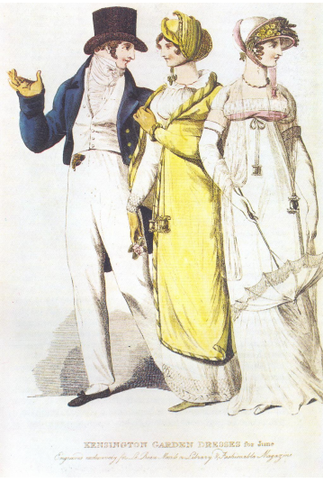 Os alfaiates de Londres eram especialmente habilidosos no trabalho com a casimira, tecido que podia ser facilmente moldado e esticado. As roupas usadas pelos aristocratas do século XVIII não se ajustavam ao corpo, ao contrário da moda dândi, cujo principal representante era o inglês George Brummell (imagem 6), que se orgulhava das suas roupas n„o terem uma só ruga e seus calções ajustarem-se perfeitamente ás suas pernas.