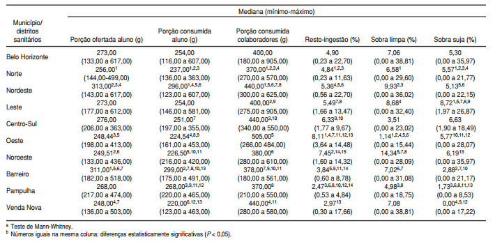 Adicionalmente, foram realizados os testes de variância unidirecional ANOVA com Tukey HSD post hoc (para comparar as médias das variáveis nos diferentes distritos sanitários); qui-quadrado (c2) de Pearson (para verificar os motivos de alteração dos cardápios e a adequação dos nutrientes); KruskalWallis e Mann-Whitney (para comparar medianas entre os distritos); Wilcoxon (para comparar as medianas dos nutrientes com os valores estabelecidos pelo PNAE e a proposição da SMASAN); e correlação de Spearman (para verificar se havia relação entre as variáveis quantitativas). Em todas as análises, considerou-se nível de significância de 5% (P < 0,05).