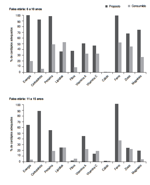 A figura 1 ilustra a inadequação dos cardápios propostos e dos consumidos nas unidades educacionais públicas integradas comparados ao PNAE. Para a faixa etária de 6 a 10 anos, verificou-se que 100% dos cardápios propostos eram adequados em energia e ferro, enquanto nenhum cardápio atingiu os valores recomendados para cálcio. Para a mesma faixa etária, 51,40% dos cardápios consumidos estavam adequados para o teor de lipídio, e não houve alcance dos valores recomendados para cálcio. Já para crianças entre 11 e 15 anos, houve maior porcentagem de cardápios propostos e consumidos adequados para ferro, respectivamente, 100% e 35,70%. A menor porcentagem de cardápios adequados, propostos e consumidos foi para o cálcio (0%) (figura 1).