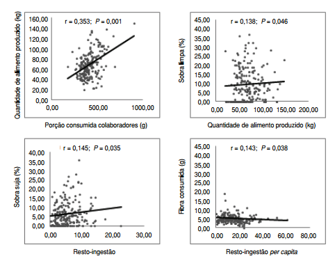 porção consumida pelos colaboradores (r = 0,353; P < 0,0001) e à porcentagem de sobra limpa (r = 0,138; P = 0,046). A resto-ingestão per capita correlacionou-se com a porção consumida pelos colaboradores (r = 0,162; P = 0,018). Ademais, houve correlação significativa proporcional de resto-ingestão com sobra suja (r = 0,145; P = 0,035) e inversamente proporcional com consumo de fibras (r = –0,143; P = 0,038) (figura 2).